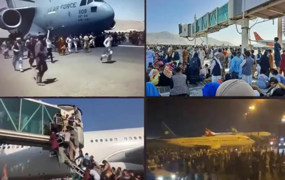 16日,由于人群涌入造成混乱,喀布尔机场停飞数小时。(图片来源:法新社)