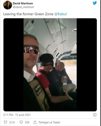 法国驻阿富汗大使马蒂农(左一)从“绿区”转移至喀布尔机场办公。(图片来源:马蒂农推特截图)