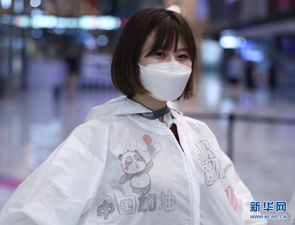 8月19日,在东京成田机场,一名国航工作人员身着为运动员加油打气标语的防护服。