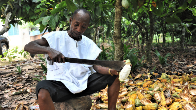 在加纳东部省一处可可种植园,一名种植户在可可果实里面取出新鲜的可可豆。(图片来源:新华社)