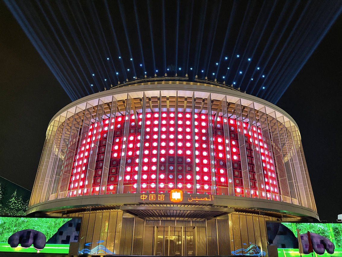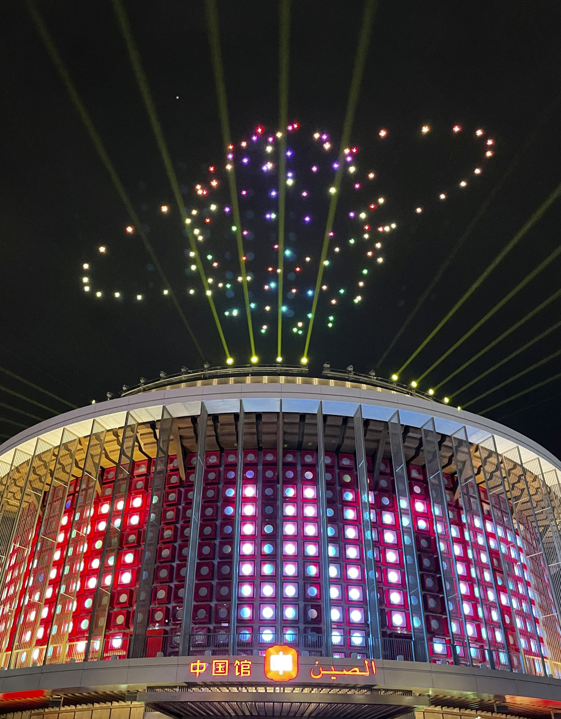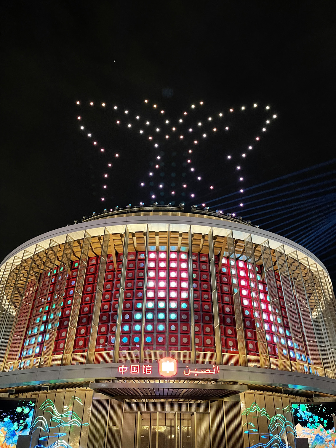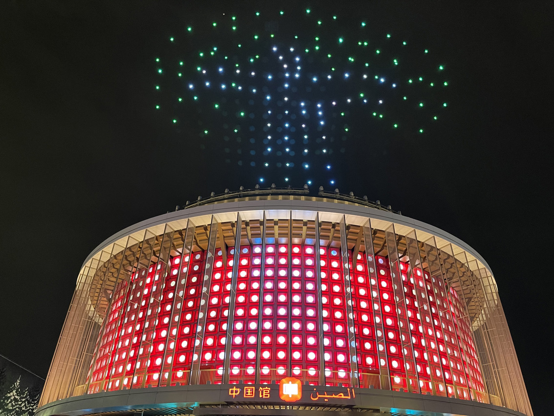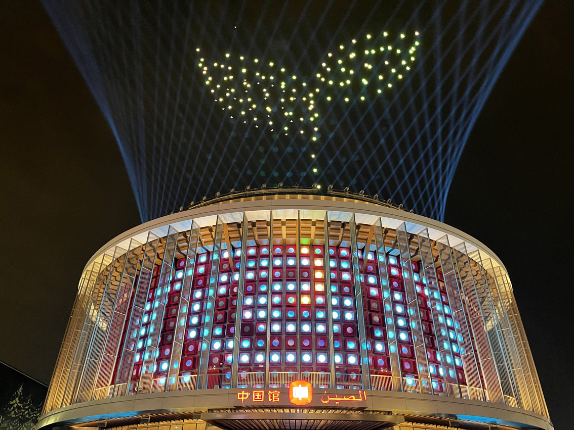 灯光秀通过中国馆外墙上1312块LED发光体与150架无人机的矩阵表演相配合,实现大范围的动态视觉效果。