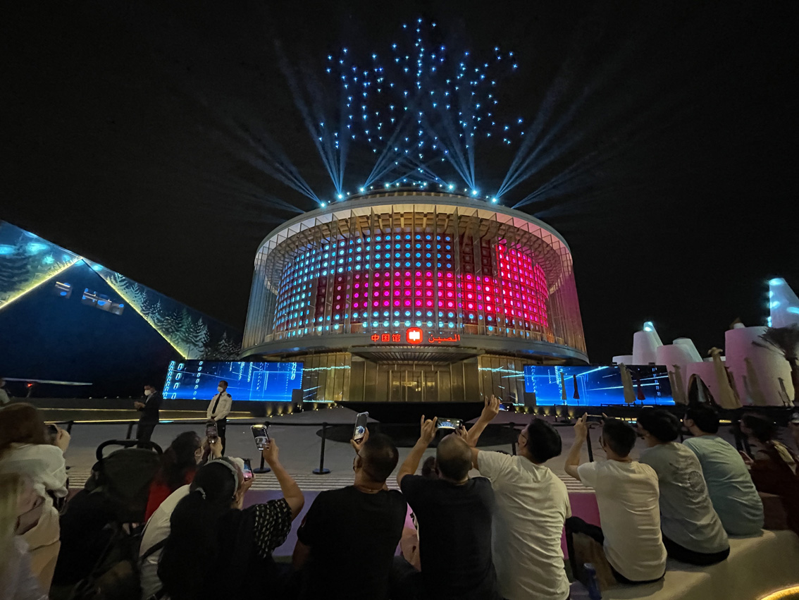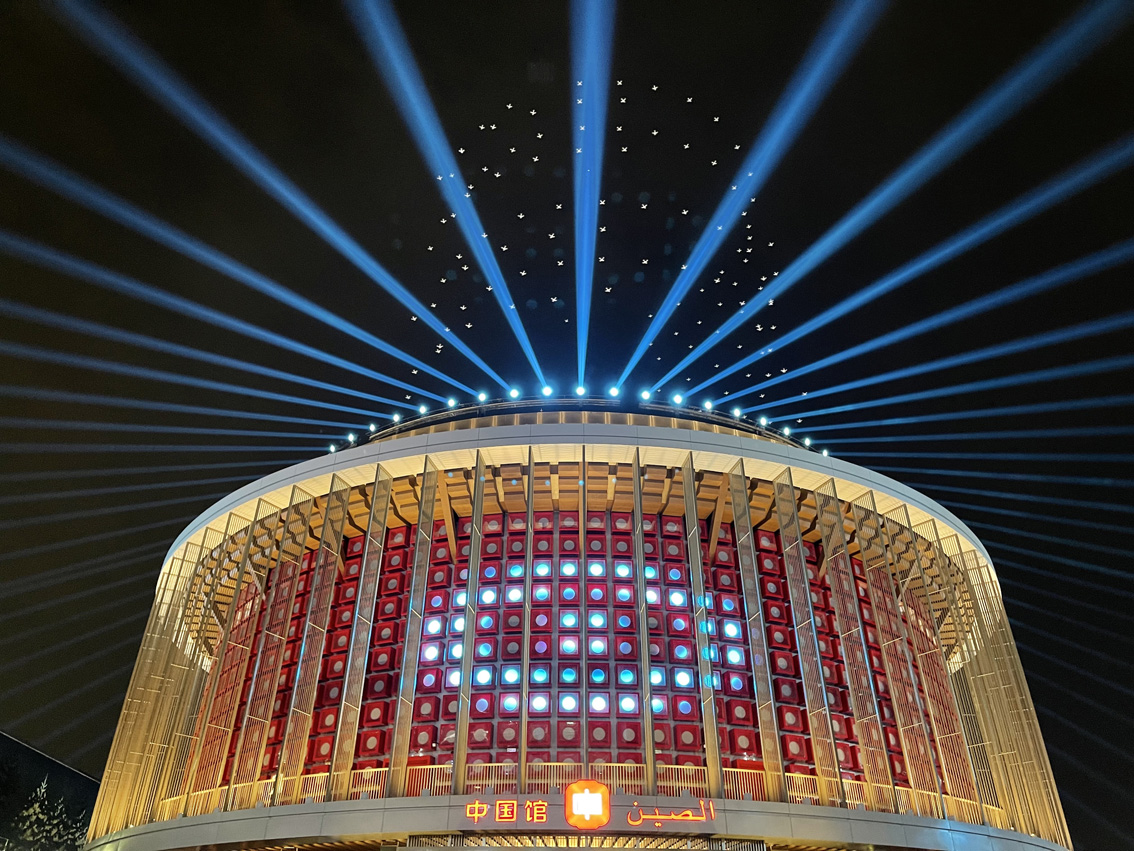 迪拜世博会中国馆自10月1日开馆以来,每晚上演的大型主题灯光秀受到游客的欢迎。灯光秀以“华夏之光”为主题,通过中国馆外墙上1312块LED发光体与150架无人机的矩阵表演相配合,实现大范围的动态视觉效果,为游客献上一场震撼的视听盛宴。