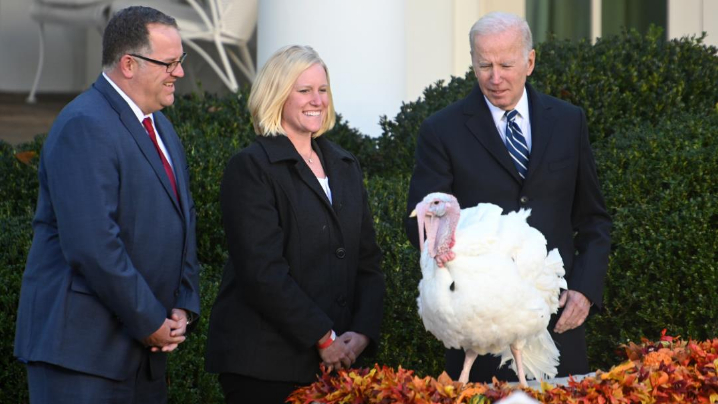 “它俩据说是20只候选‘幸运’火鸡中的优胜者,换句话说,是经历过火鸡‘总统初选’的。”拜登在当天的仪式上打趣道:“‘花生酱’和‘果冻’胜选,是根据它们的性格、外貌,我怀疑还有疫苗接种情况。”