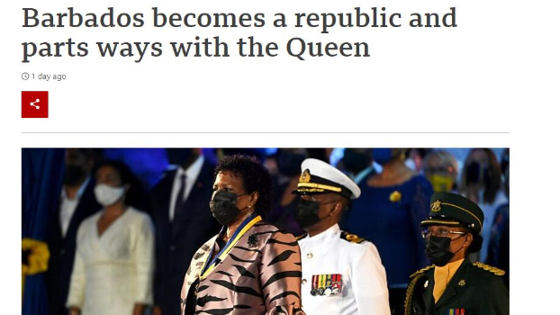 巴巴多斯取消英女王国家元首地位,成为世界上最年轻的共和国。(图片来源:BBC网页截图)
