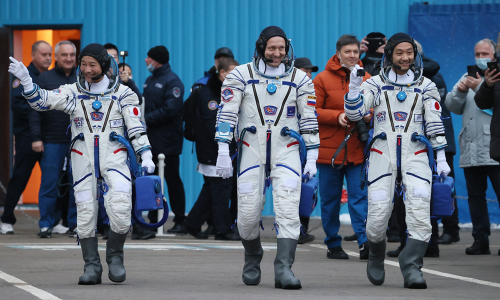 12月8日,哈萨克斯坦境内的拜科努尔航天发射场,“联盟MS-20”号飞船即将发射升空,米苏尔金(中)、前泽友作(左)及其助手挥手致意。(图片来源:CFP)