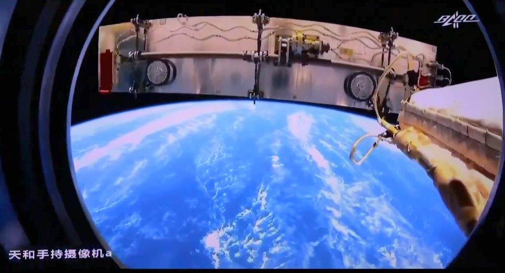 神舟十二号航天员刘伯明通过卧室舷窗观看美丽地球。(图片来源:中新社)