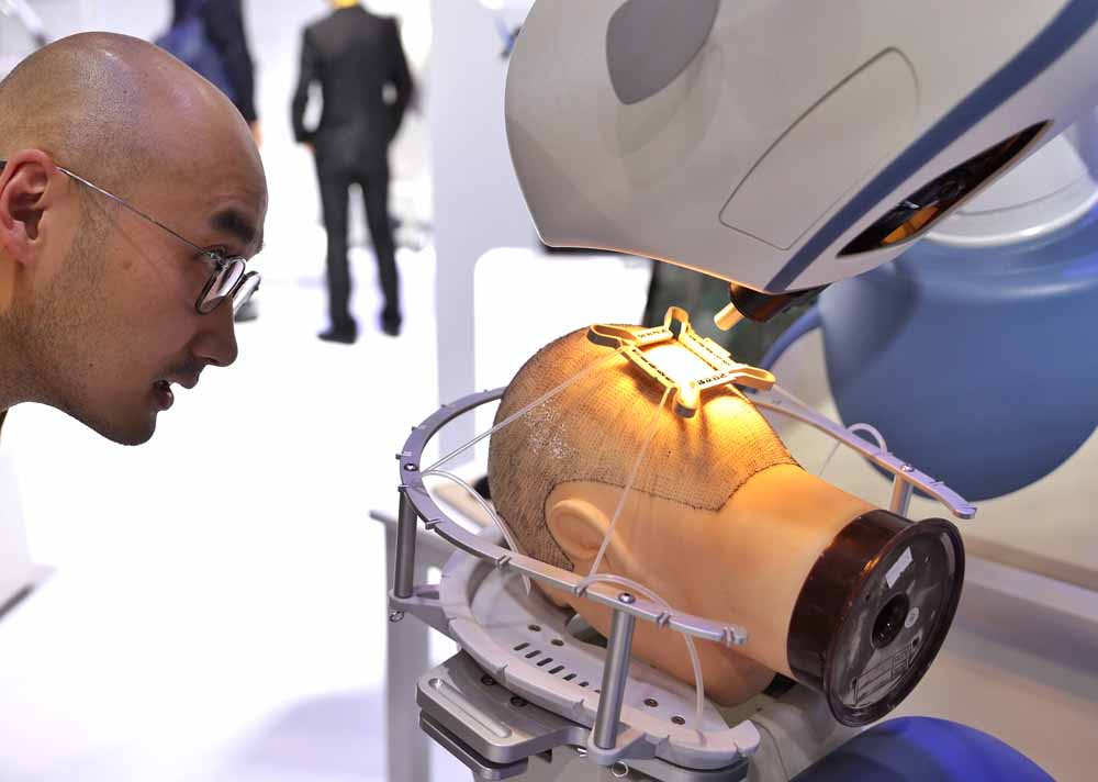 图为一款植发手术辅助机器人,可在一小时内帮助患者植发1500根。(图片来源:中新社)