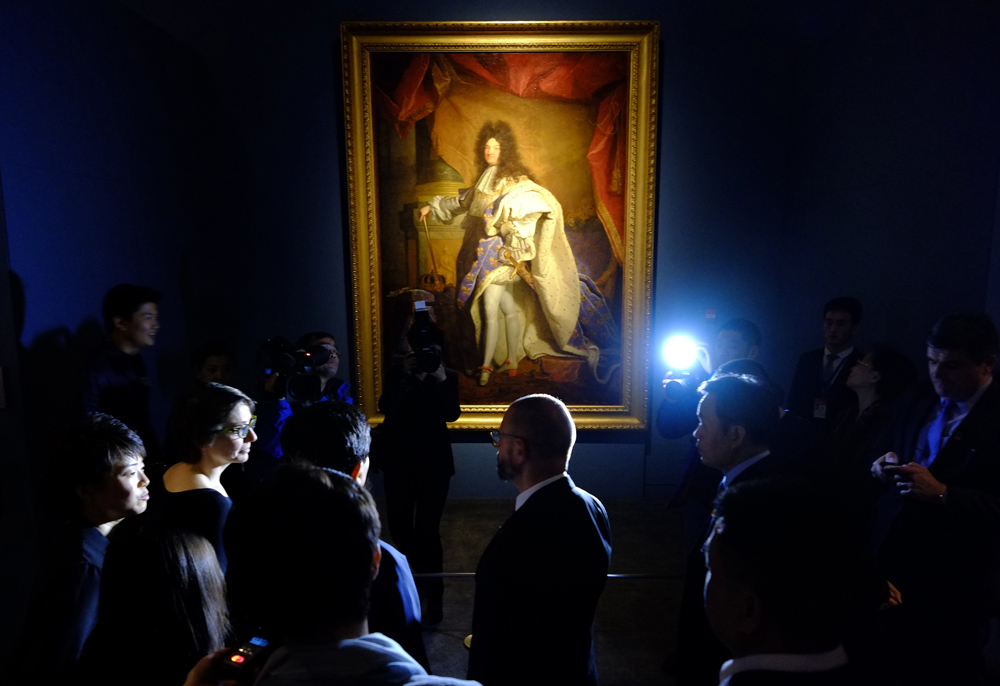 中国国家博物馆展出的油画《63岁时着加冕服的路易十四全身像》。(图片来源:中新社)