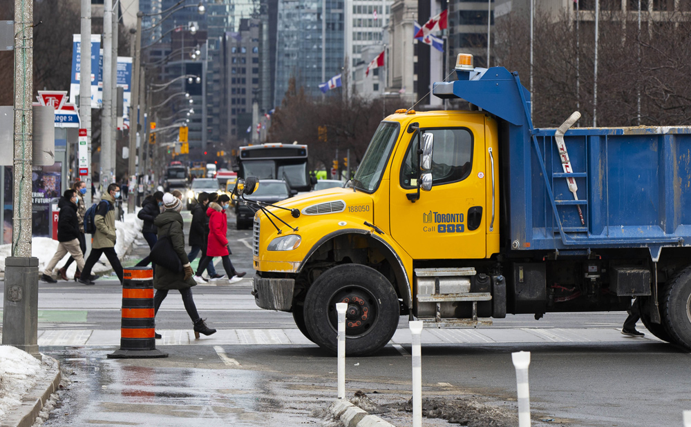 2月11日,在加拿大安大略省多伦多市,警方调动市政卡车封锁了安大略省议会大厦前的街道。1月29日,加拿大首都渥太华爆发多达数千人的抗议活动,反对政府的新冠限制措施。(图片来源:新华社)