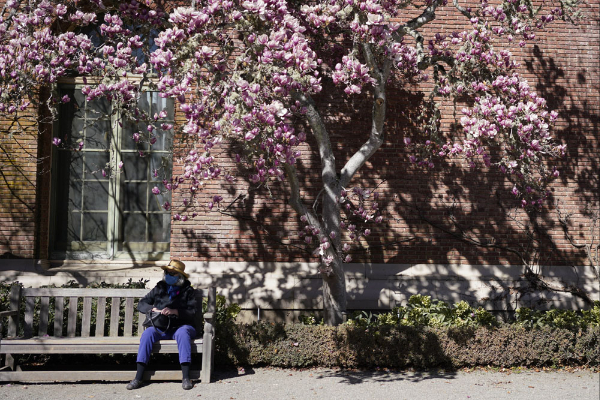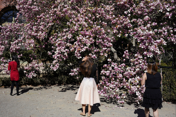 2月21日,参观者在费罗丽花园里欣赏春色。
