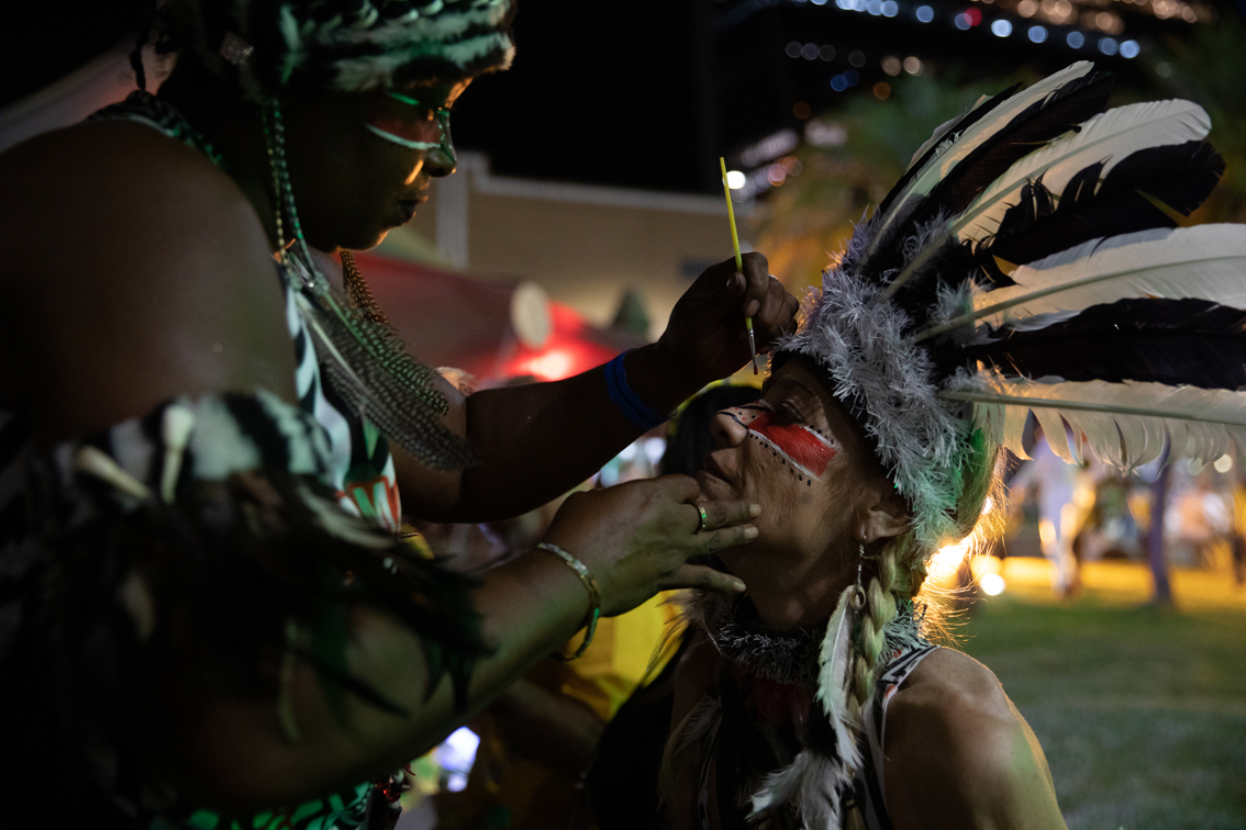 2月26日,两名表演者在巴西里约热内卢桑巴之城参加狂欢节假期庆祝活动时补妆。