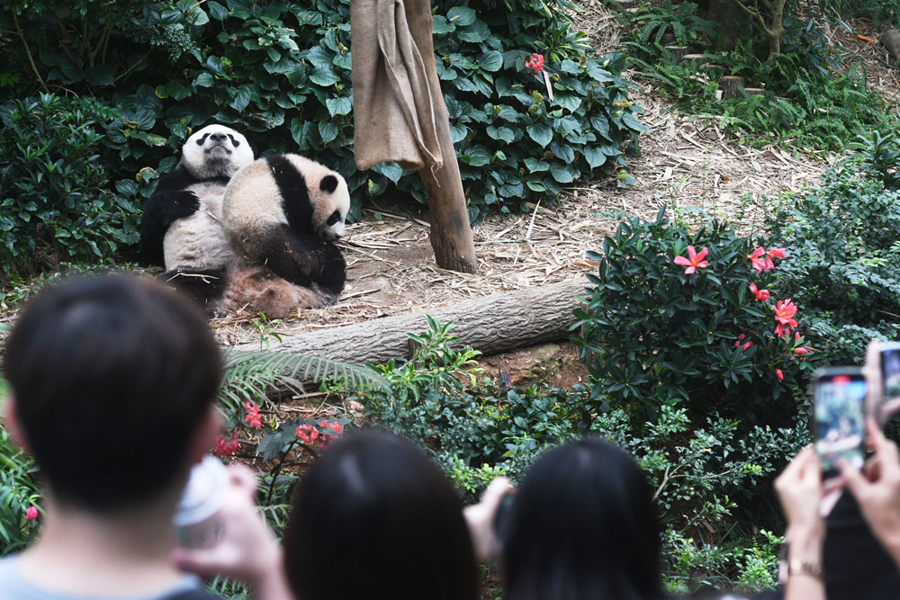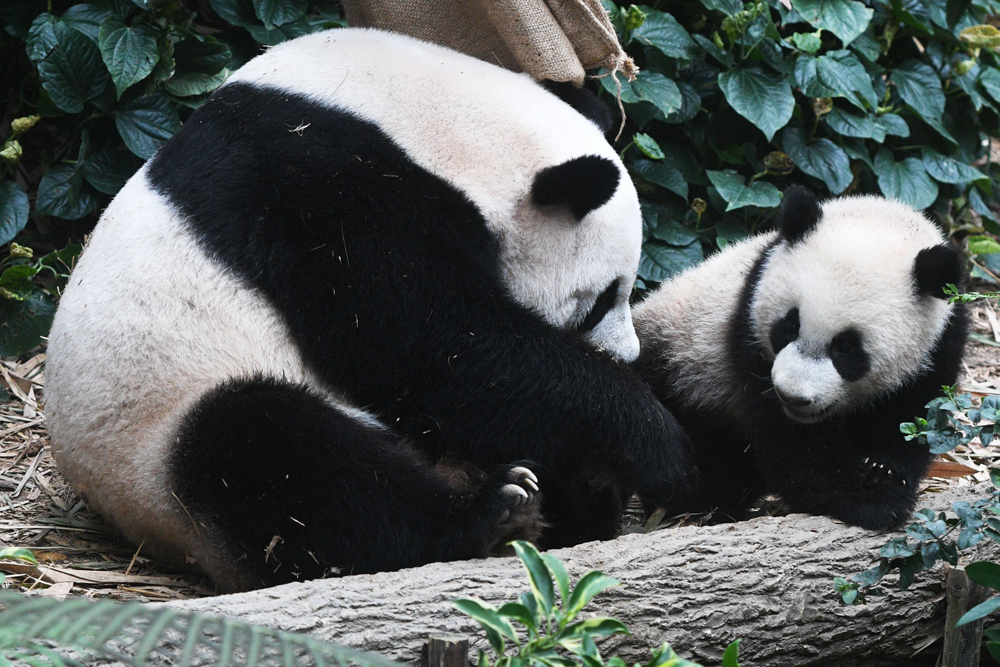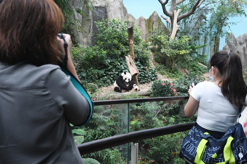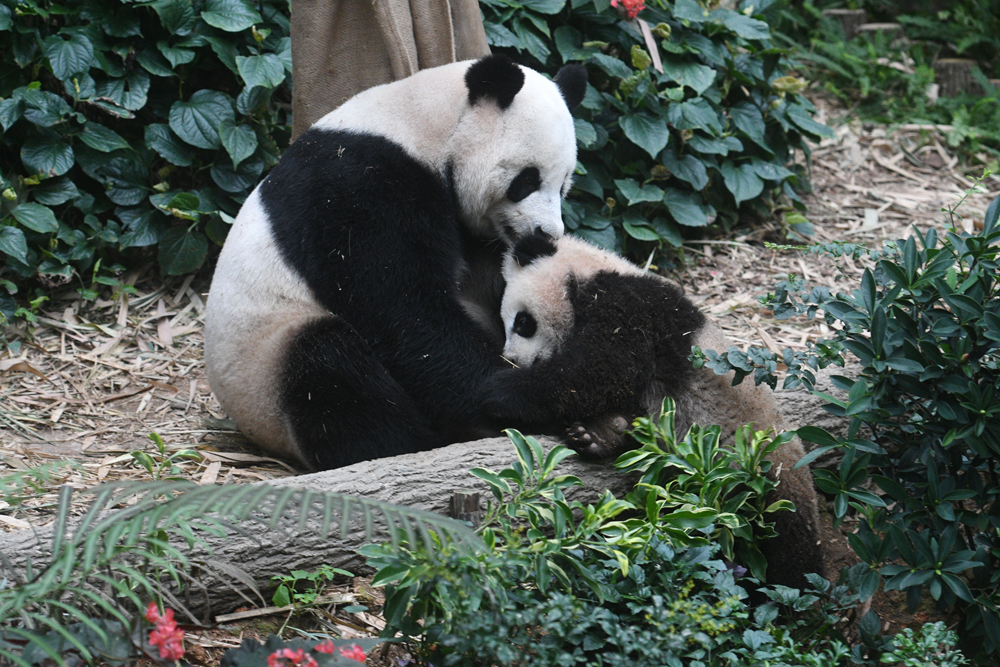 3月10日,在新加坡河川生态园,大熊猫幼崽叻叻和母亲嘉嘉在一起。