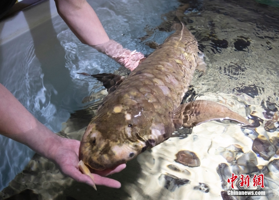 美国加州科学博物馆员工艾伦·简为肺鱼喂食。