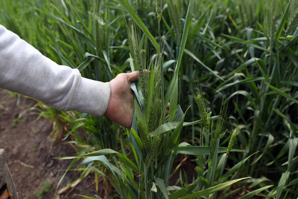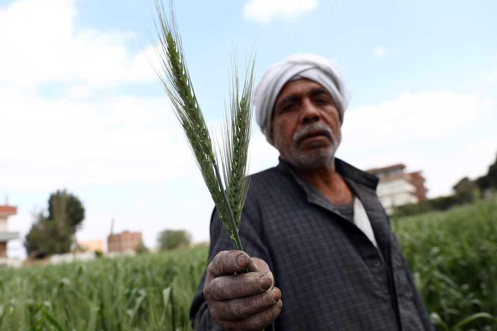 3月14日,农民在埃及盖勒尤卜省的农田中展示麦穗。