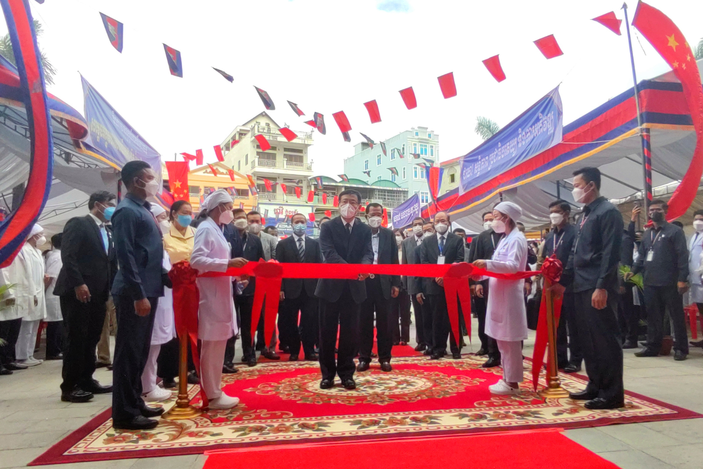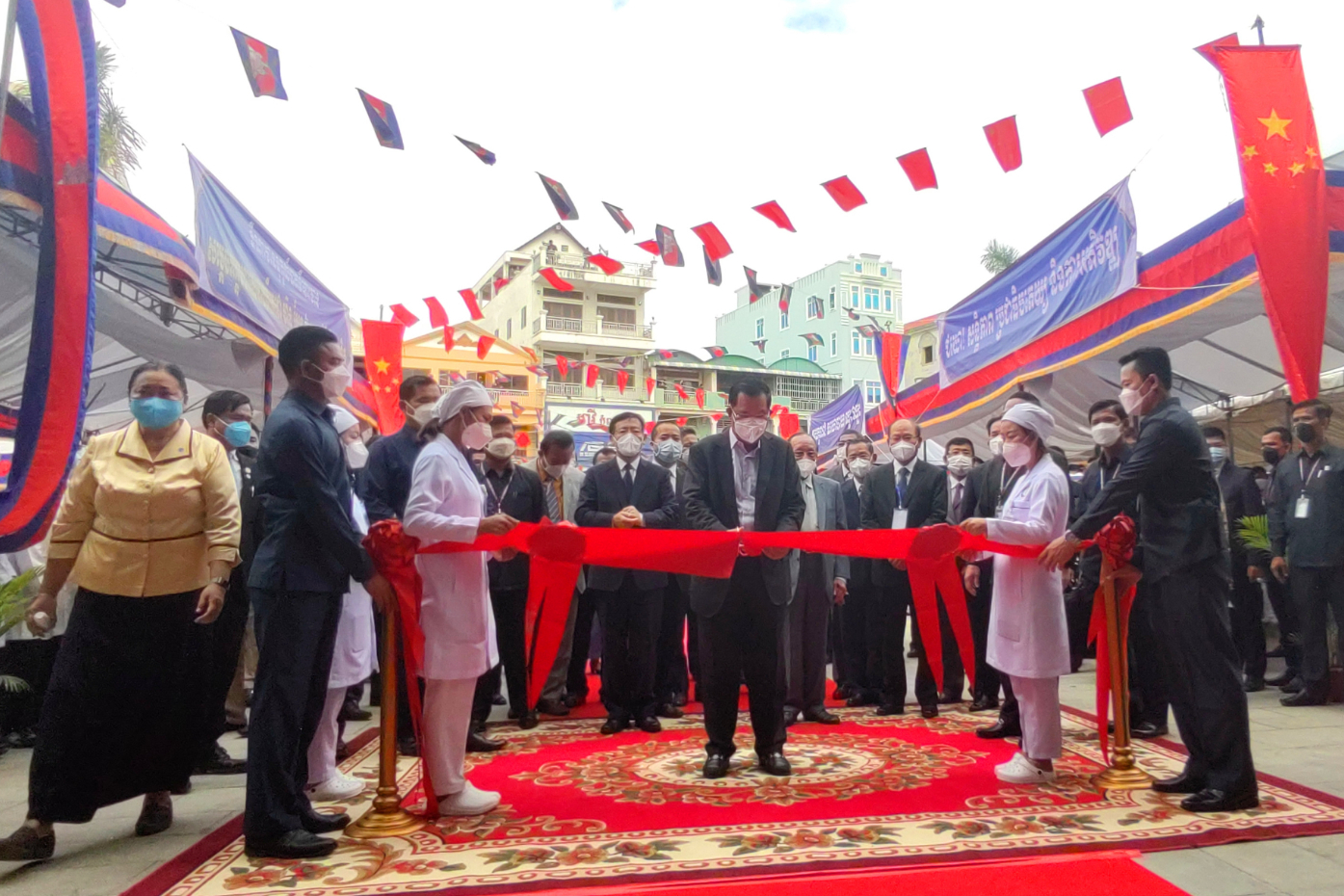 柬埔寨首相洪森同中国驻柬埔寨大使王文天21日在金边共同出席考斯玛中柬友谊医院启用仪式。