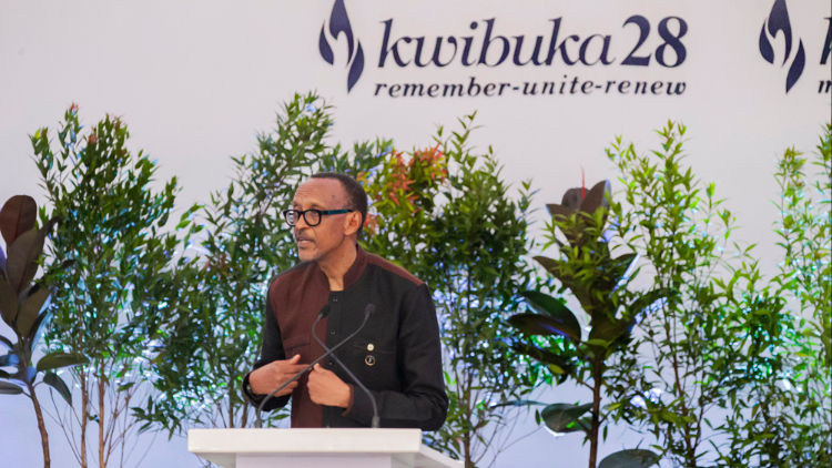 4月7日,卢旺达总统卡加梅在基加利举行的大屠杀28周年纪念活动上发表讲话。(图片来源:新华社)