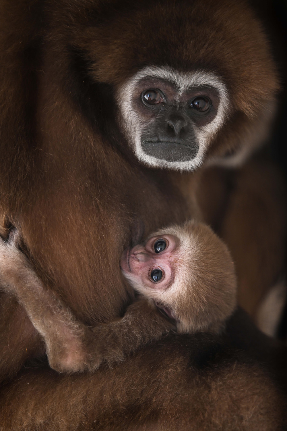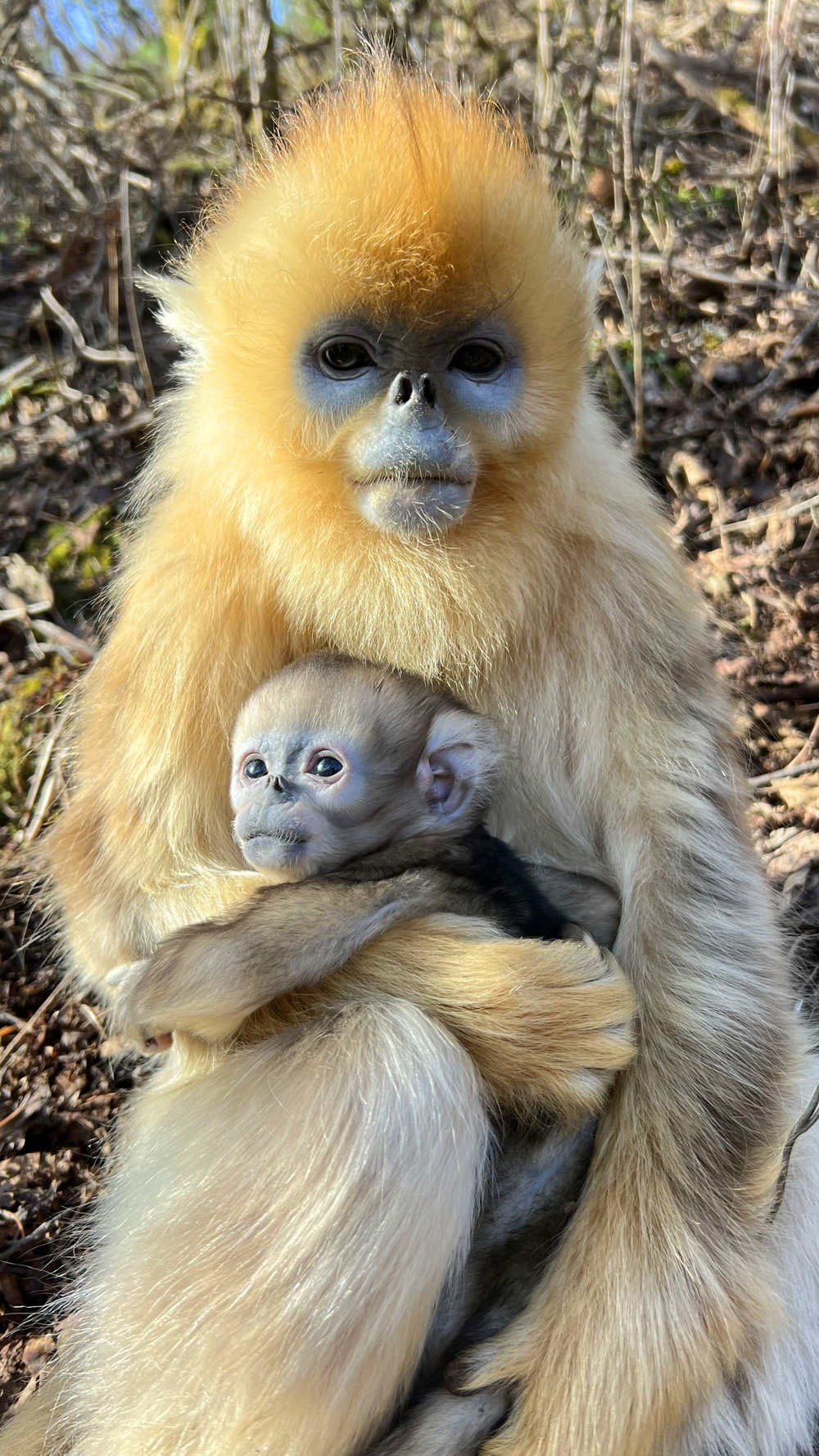 4月8日,湖北神农架国家公园大龙潭金丝猴科研基地传来好消息,该基地近10天出生了7只金丝猴宝宝,这也是有记录以来金丝猴集中产仔最多的一次。得益于保护人员多年努力,以及当地生态环境不断改善,神农架金丝猴由20世纪80年代的500多只增至现在的1400多只。图为新生的金丝猴紧紧依偎在母亲怀中(4月7日拍摄)。(图片来源:中新社)
