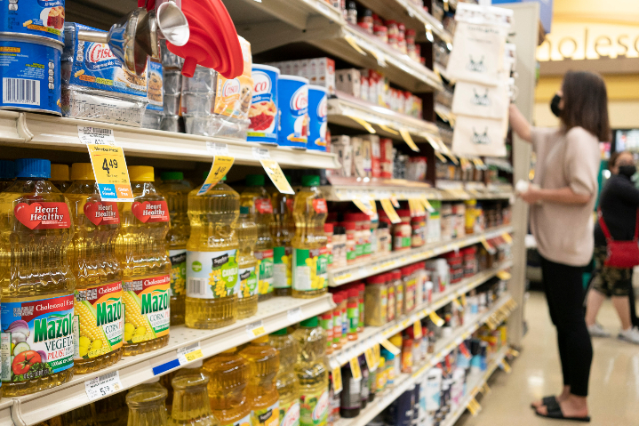 当地时间4月9日,美国加州圣马特奥县一家超市内待售的植物油。(图片来源:中新社)