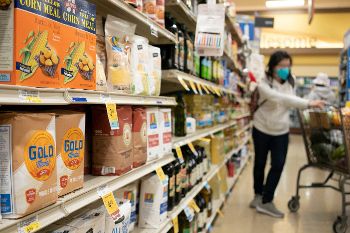 美国加州圣马特奥县一家超市内待售的面粉及玉米粉等食品。(图片来源:中新社)