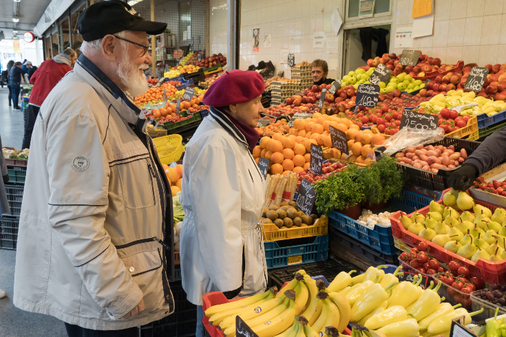 顾客在匈牙利布达佩斯的一个市场内购物。