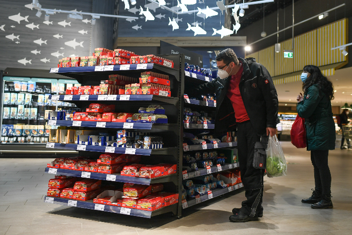 消费者在德国法兰克福一家超市内选购食品。近来德国食用油和面粉等销售明显增长,主要食品零售超市已宣布涨价。