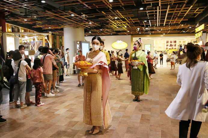 时值泰历新年泼水节(宋干节)假期,曼谷街头不见“水花四溅”的景象。由于疫情原因,泰国政府规定今年泼水节不得进行泼水、相互抹粉等活动,但可以举行传统文化活动。图为14日,泰国曼谷一知名商场内举行敬佛表演。(图片来源:中新社)
