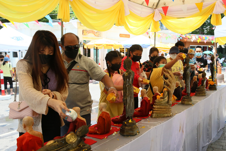 泰国市民市民在一处佛寺内为佛像浇水“浴佛”。(图片来源:中新社)