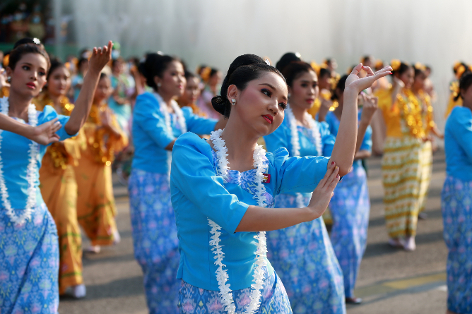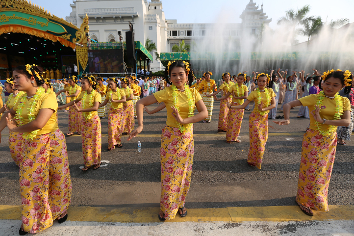 泼水节也是缅甸传统节日,今年的泼水节将持续4天。图为13日,舞蹈演员在缅甸仰光举行的泼水节庆祝活动上表演。(图片来源:新华社)
