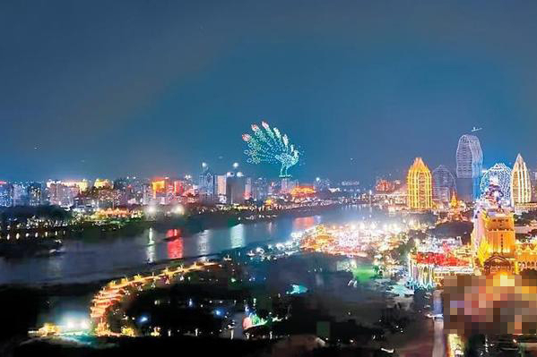 图为景洪市上演了一场精彩的“千机秀”。12日晚,1000架无人机从澜沧江畔升起,在夜空中组成“欢度泼水节”的字样,随即变换队形,依次组成“孔雀开屏”和“吉祥大象”等图案,营造了喜庆祥和的节日氛围。(图片来源:云南网)