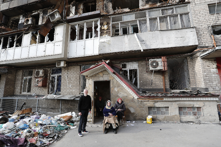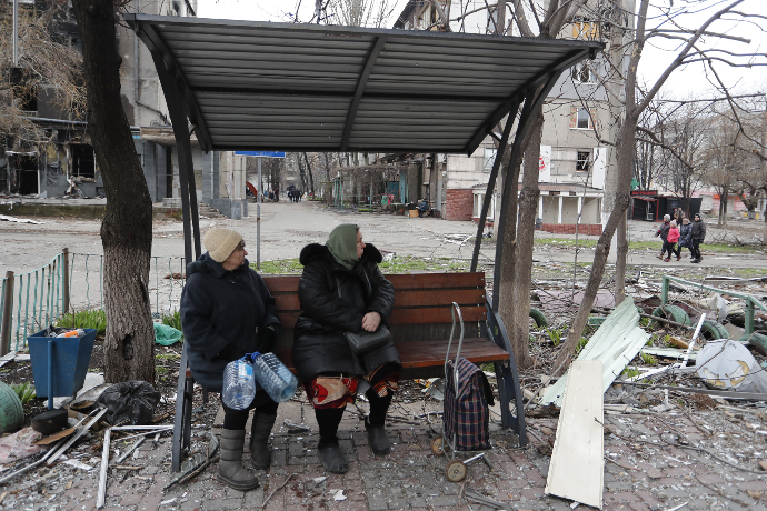 在马里乌波尔,当地居民在被损坏的建筑旁休息。