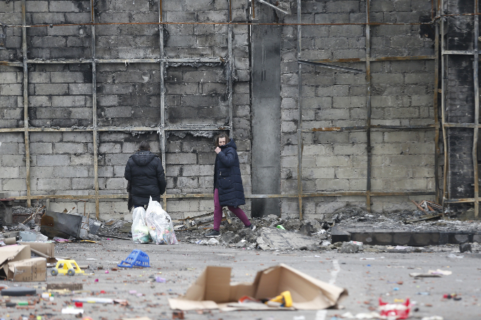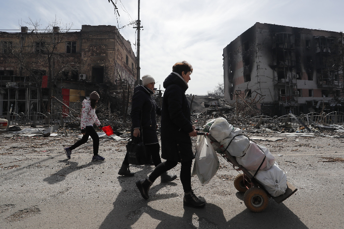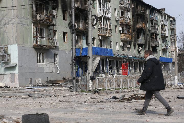 马里乌波尔当地居民从被损坏的建筑旁走过。