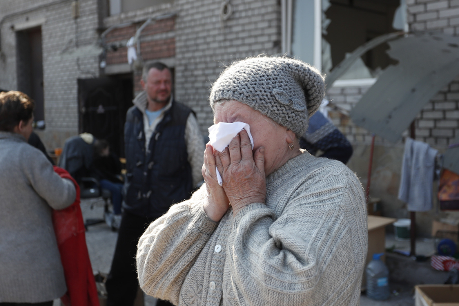 7日,在马里乌波尔,一名妇人擦拭面部。