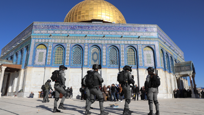 4月15日,以色列安全部队在位于耶路撒冷老城的阿克萨清真寺执勤。(图片来源:新华社)