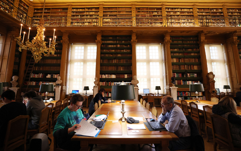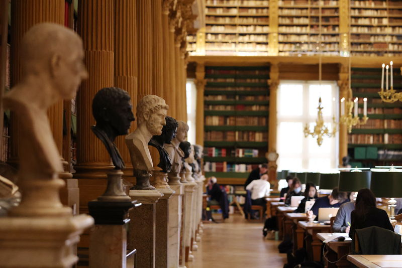 马扎然图书馆位于法国巴黎塞纳河左岸的法兰西学院内。创建于17世纪,是法国最古老的公共图书馆,也是拥有法国最丰富珍本书籍和手稿的图书馆之一。图为4月20日,人们在法国巴黎马扎然图书馆内阅读。(图片来源:本文图片综编自新华社)