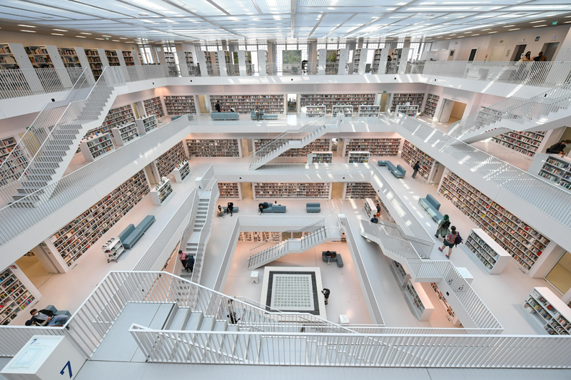 德国斯图加特市立图书馆建筑外观呈立方体,内部采用中空设计,书柜放置在四周,中空部分用错位的楼梯连接,营造出独特的空间感和设计感,自2011年建成后成为当地的文化名片和众多游客的“打卡”地点。图为4月19日,人们在德国斯图加特市立图书馆内参观。