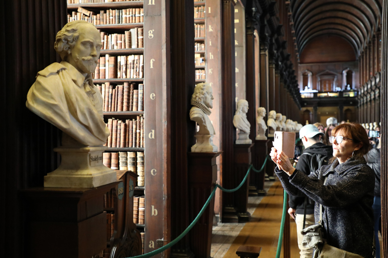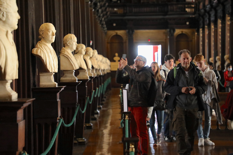 都柏林大学圣三一学院建于1592年,共有6个图书馆,其中最负盛名的是老图书馆。该馆以其丰富的藏书藏品和独特的建筑风格而闻名遐迩,是爱尔兰著名的人文景点之一。图为4月20日,人们在爱尔兰都柏林大学圣三一学院老图书馆内参观。