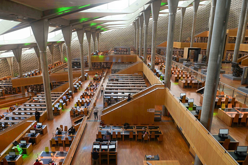 在约2300年前的埃及托勒密王朝时期,亚历山大图书馆是世界上藏书最丰、语言文种最多的图书馆。后屡遭劫难,图书馆在公元415年被摧毁殆尽。如今的亚历山大图书馆于2002年建成,坐落在地中海南岸的埃及港口城市亚历山大的海滨大道。图书馆建筑呈圆柱体,屋顶为圆柱体斜切面,图书馆最底层低于海平面10米,最高点在海平面以上约30米。亚历山大图书馆不仅是图书馆,更是一个博物馆、艺术馆和综合科研机构,被誉为“埃及文化中心”、“思想、文化和科学的灯塔”。图为4月19日在埃及亚历山大拍摄的亚历山大图书馆内景。
