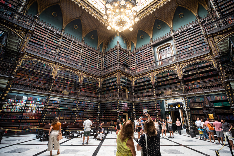 巴西皇家葡文图书馆由葡萄牙建筑师拉斐尔·达席尔瓦·卡斯特罗设计,建于1880年至1887年间,采用新曼努埃尔设计风格。这座图书馆自1900年开始向公众开放,收藏有超过35万卷葡萄牙语书籍与作品,是目前葡萄牙以外收藏最多葡语书籍和作品的图书馆。馆内彩色玻璃穹顶、枝型吊灯和木制书架设计精美,每年吸引大量游客前来参观。图为4月19日,在巴西里约热内卢,人们在皇家葡文图书馆内参观拍照。