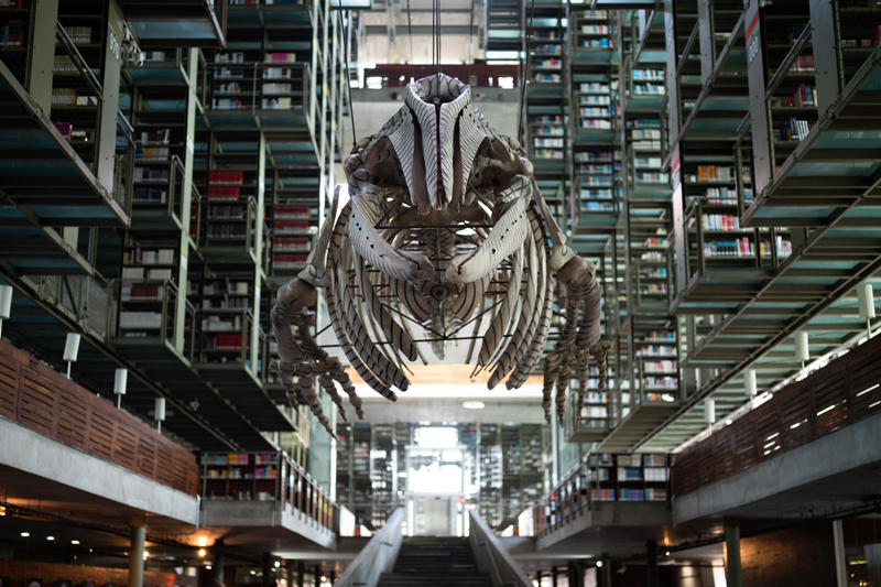 巴斯孔塞洛斯图书馆由墨西哥著名的建筑设计师阿尔韦托·卡拉什设计,图书馆以20世纪20年代墨西哥政府教育部长何塞·巴斯孔塞洛斯的名字命名,于2006年5月建成并开始向公众开放。据了解,巴斯孔塞洛斯图书馆采用自然通风系统,大量使用金属构件,馆中悬挂一具于墨西哥境内发现的灰鲸骨骼,图书馆因其独特的设计和布置享誉业界。图为4月18日在墨西哥首都墨西哥城拍摄的巴斯孔塞洛斯图书馆内的灰鲸骨骼。