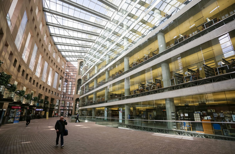 温哥华公共图书馆的中央图书馆大楼坐落于温哥华市中心,以古罗马竞技场为灵感设计,于1995年5月26日落成启用。图为4月19日在加拿大温哥华拍摄的温哥华公共图书馆中央图书馆内景。