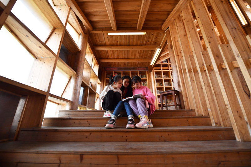 坪坦书屋位于湖南省通道侗族自治县坪坦乡中心小学,由广州大学和香港中文大学的团队设计并募资建造,于2021年10月建成投入使用。坪坦书屋将侗族传统“干栏式”建筑结构与现代建筑设计理念相结合,融合现代空间设计和侗族公共空间理念,目前有藏书13900册。图为4月20日,坪坦乡中心小学的学生在坪坦书屋里看书。