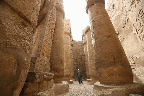4月26日,工作人员在埃及卢克索神庙内巡看。