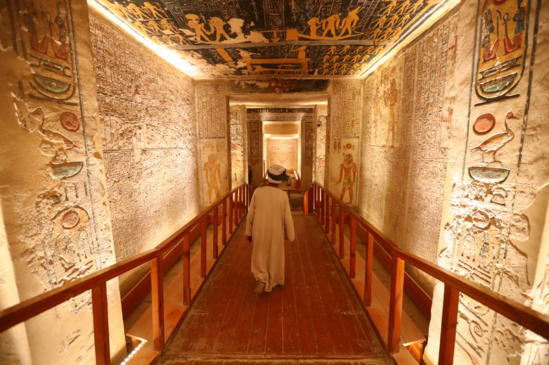 4月26日,在埃及卢克索帝王谷,工作人员在法老拉美西斯六世陵墓内巡视。(图片来源:本文图片均自新华社)