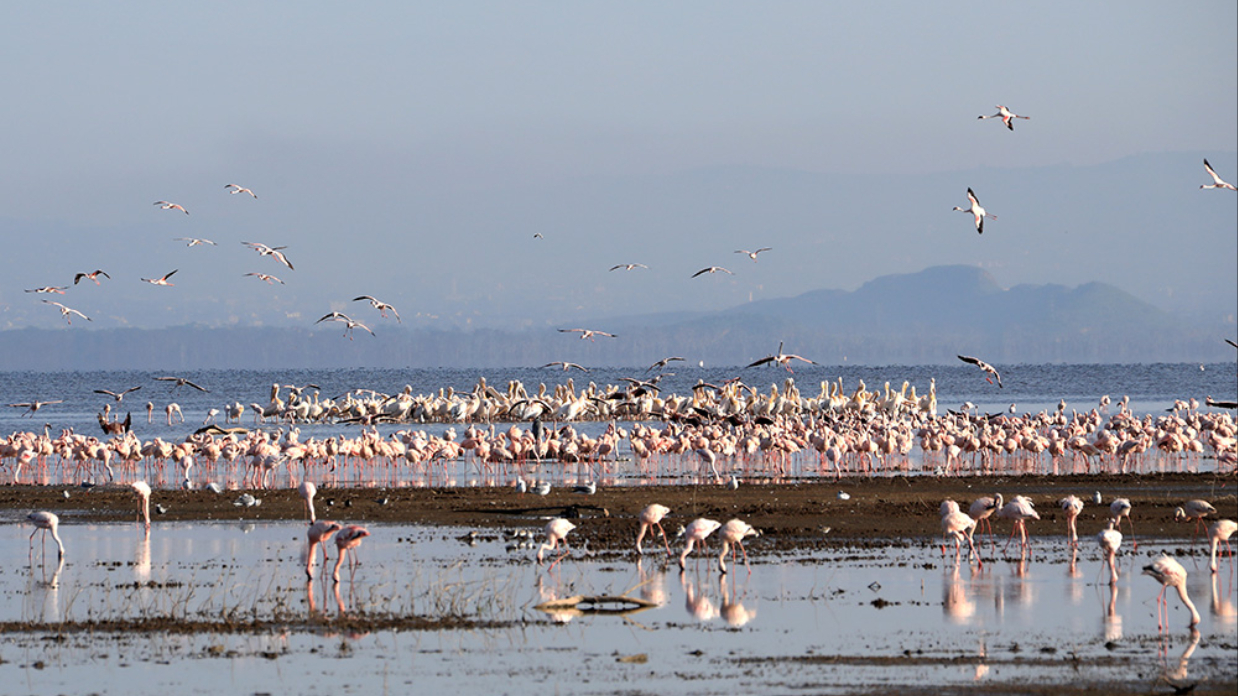 5月13日在肯尼亚纳库鲁湖国家公园拍摄的火烈鸟和鹈鹕。(图片来源:新华社)