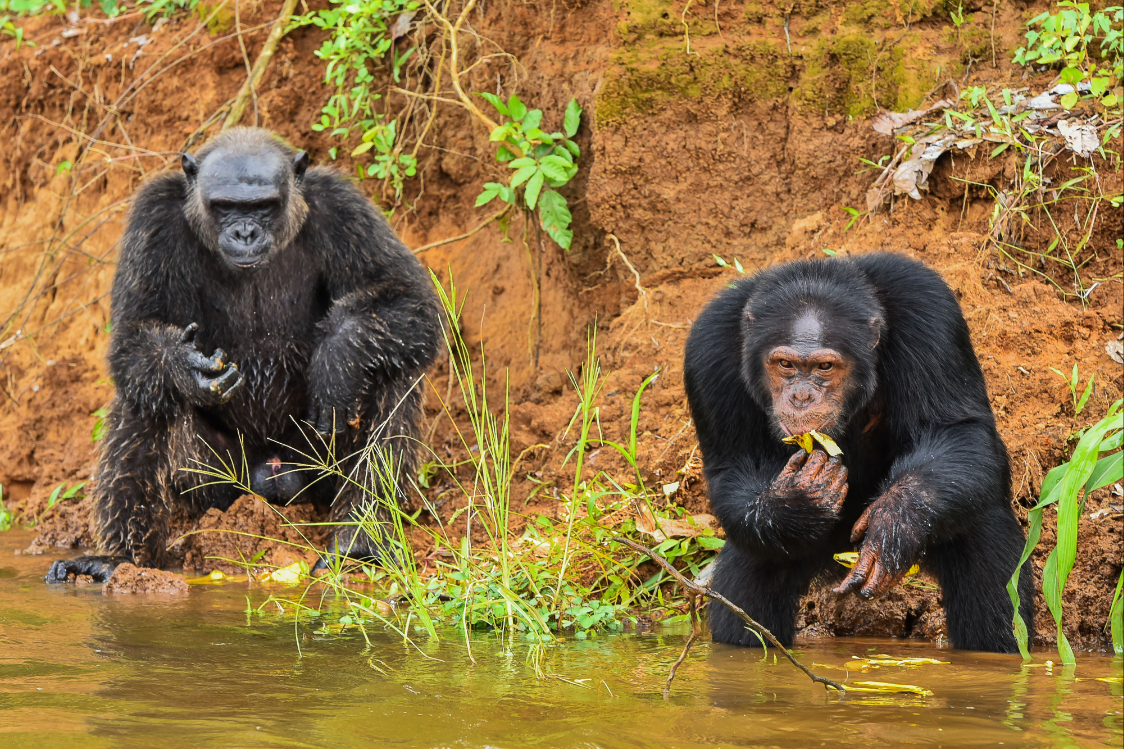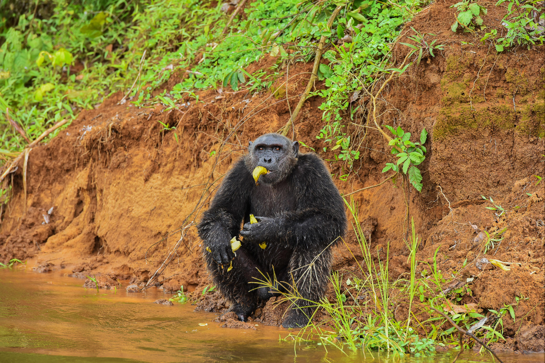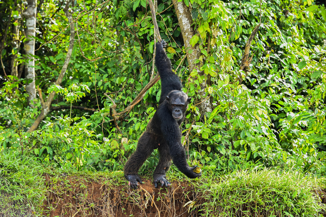 4月20日在喀麦隆滨海大区杜阿拉-埃代阿国家公园里拍摄的黑猩猩。(图片来源:新华社)