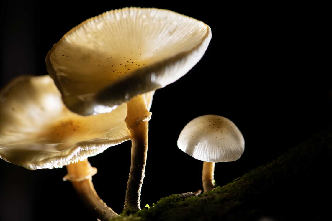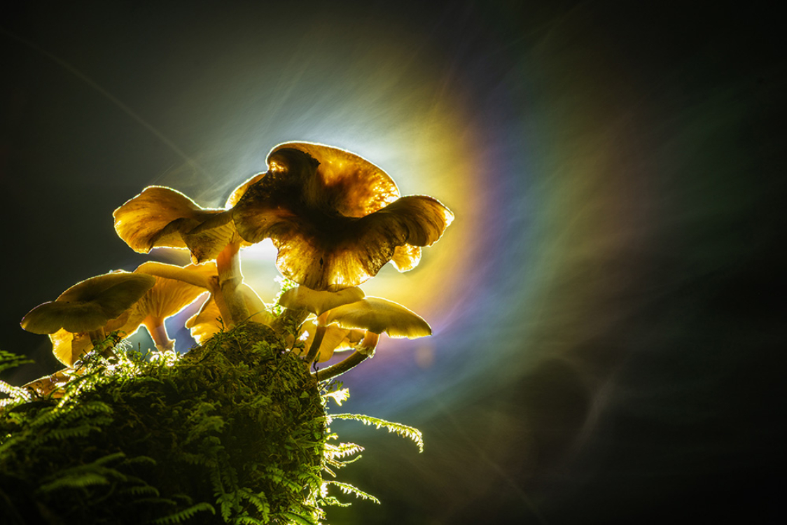 3月27日,在新西兰南岛福克斯西海岸温带雨林中,一簇蜜环菌在暗夜中播撒孢子。(图片来源:新华社)