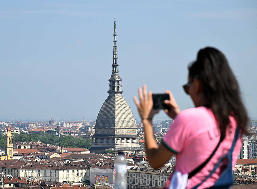 包括都灵在内的意大利多地遭遇高温天气,最高气温超过30摄氏度。图为游客在意大利都灵的安托内利尖塔附近拍照。(图片来源:新华社)