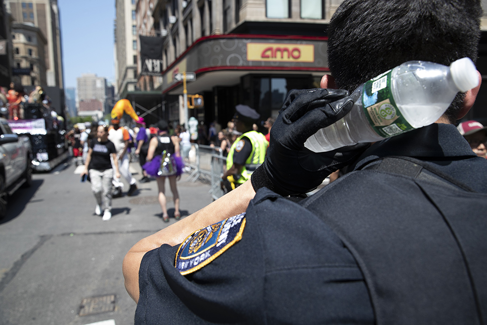 5月21日,美国纽约出现32℃高温天气,这在纽约同期气温记录中罕见。图为曼哈顿街头执勤的警察用结冰的水瓶为身体降温。(图片来源:中新社)