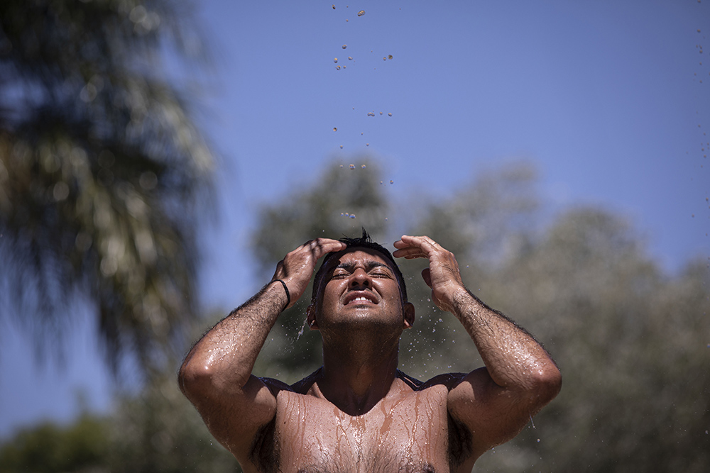 高温导致阿根廷电力供应紧张。首都布宜诺斯艾利斯和周边地区一度出现大面积停电,目前电力供应已经逐步恢复。图为一名男子用水将自己淋湿降温。(图片来源:新华社)