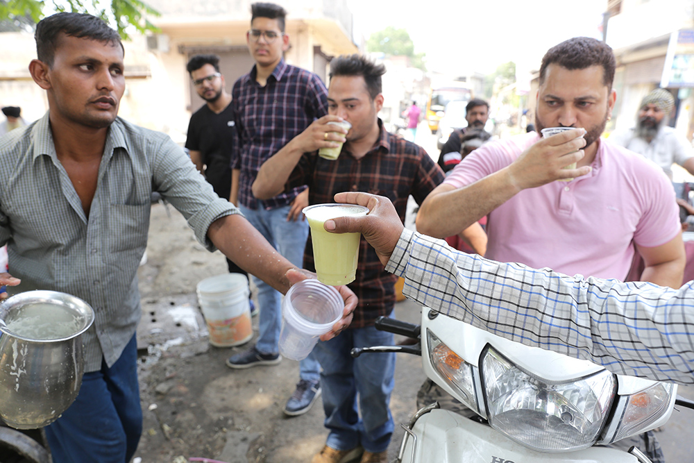 经历一个多月热浪炙烤后,印度部分地区预计本周末将出现更强热浪。图为4月29日,在印度阿姆利则,人们喝冷饮消暑。(图片来源:新华社)